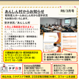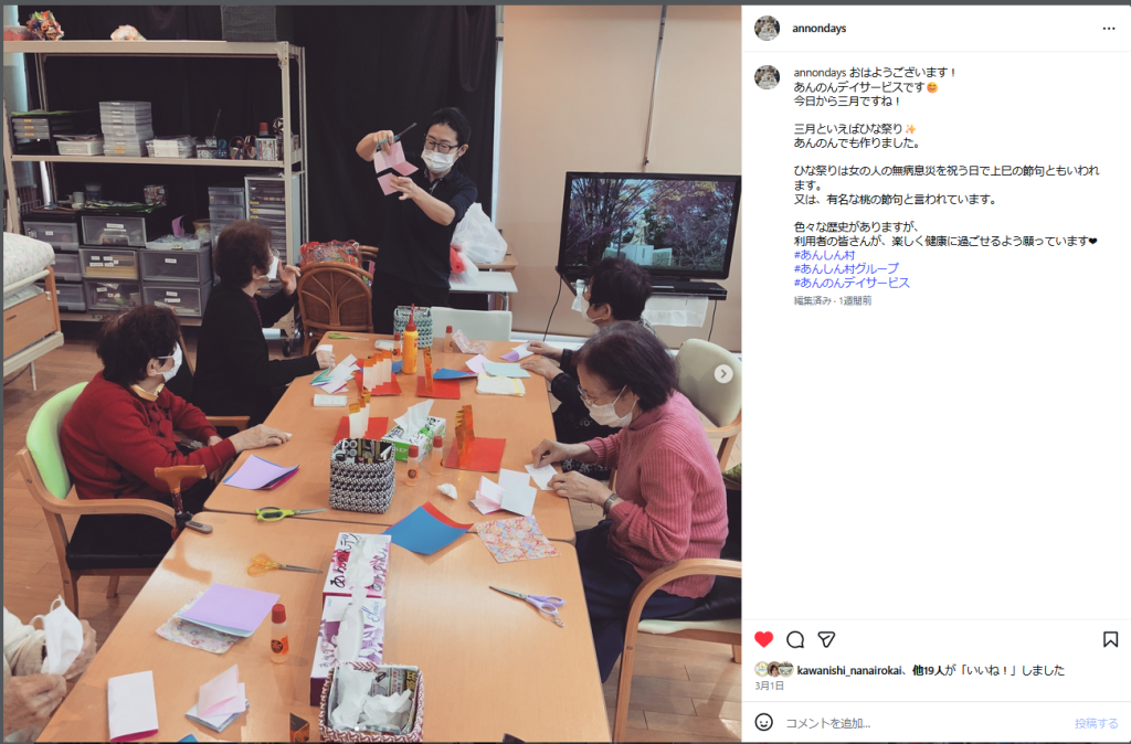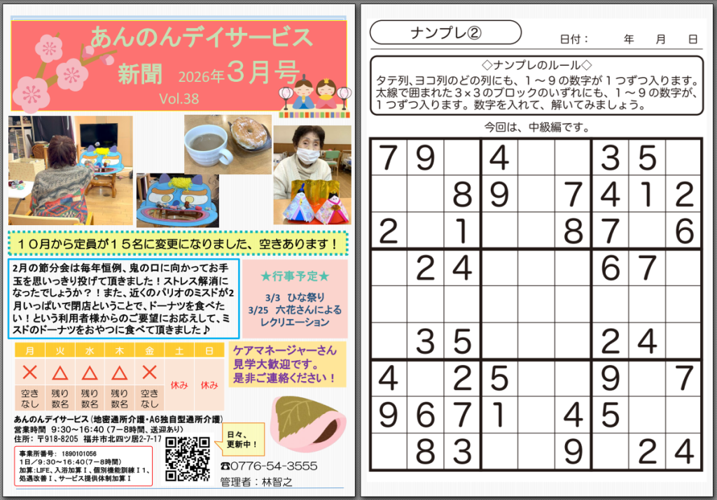 あんのんデイサービス、R8/3月号 2026年3月1日 ansinmura あんのんデイサービスの3月号 あんのんデイサービスの3月号チラシができましたので、お知らせいたします。 3月のイベント内容 3月のイベントはこちら、 3月3日(火)ひな祭り、大変もりあがりました。 (画像にリンク貼ってあります) また次回は3月25日(水)14時から自主グループ、六花さんによるマジックや作品作りなど。 参加無料、送迎は相談下さい。出来る限り対応致します。