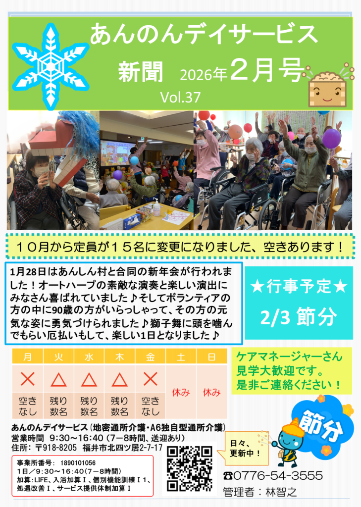あんのんデイサービス、R8/2月号 2026年2月9日 ansinmura あんのんデイサービスは、福井市地域密着デイサービスです施設入所希望の相談可・ケアマネ在住なので、合わせて利用が出来ます。要介護・要支援の方やこれから申請する方にどうぞ。 1月は、あんしん村と合同で新年会がありました。 皆様、音楽を聴いたり、おみくじをしたり、獅子舞をかぶって楽しんでおられました!