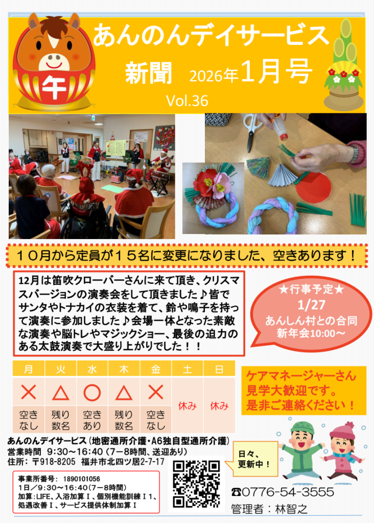 2026年1月 あんのんデイサービス 2026年1月12日 あんのんデイ 2026年1月 おはようございます! 本年もよろしくお願い致します。 あんのんデイサービスでは、今年も楽しく笑いが絶えない居場所を利用者の方々に提供していけるように 頑張っていきますので、どうか温かい目で見守って下さい。 12月は笛吹クローバーさんに来ていただき、クリスマス演奏会をしたり、 あんのんデイサービスでもクリスマス会をしたりと、 皆さんいつもとは違う雰囲気を楽しんでおられました!! 今年は、どんなイベントをしようかなと今から考えています♪ お愉しみにしてて下さい。